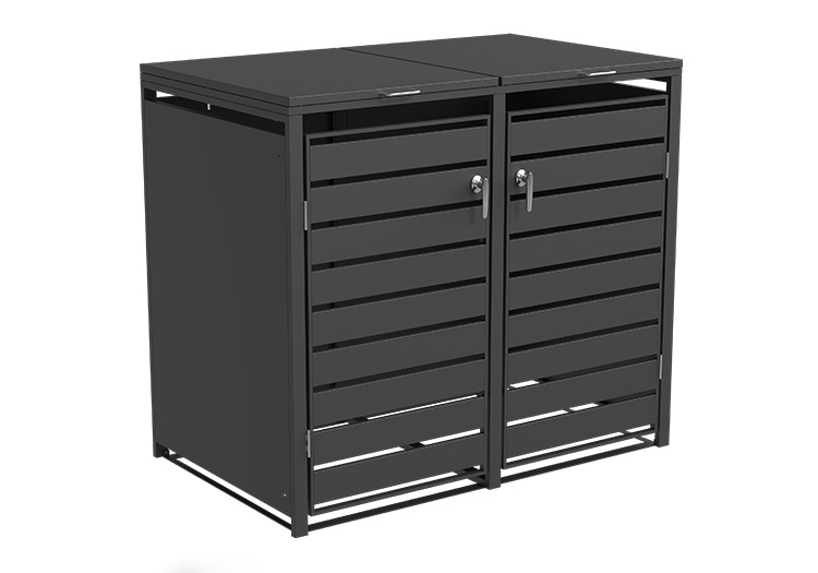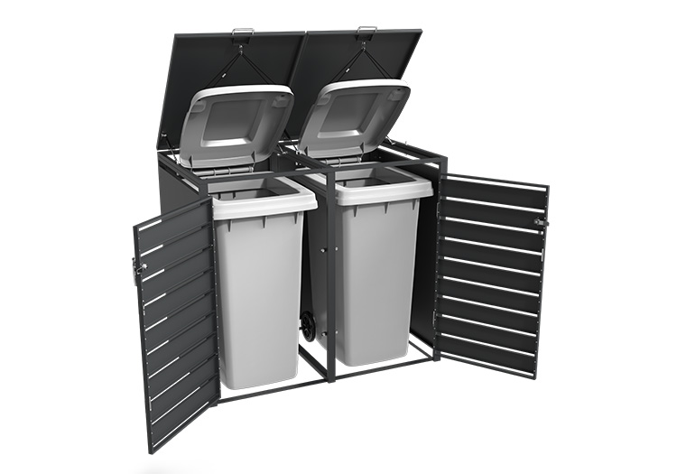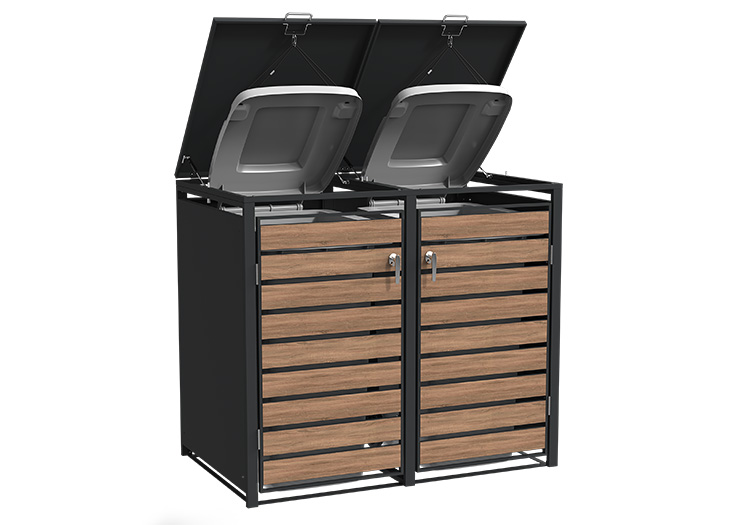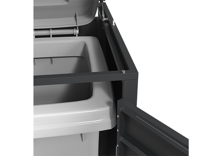 Conceal your bins with our discreet Composite bin store. The lid boasts gas springs and pressure dampers, along with a hook and chain mechanism for easy lifting and hassle-free waste disposal. Additional highlights include a soft-close lid, magnetic doors for stability in any weather, pre-drilled holes and fixings for secure ground attachment, and a concealed lock within the stainless steel handle. Compatible with 60L, 120L, and 240L wheelie bins. Offered in two colour options, two designs, and the ability to connect units together to suit individual household needs.