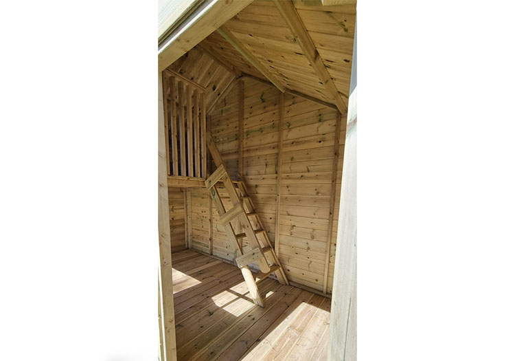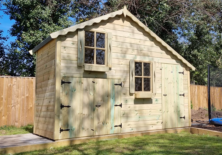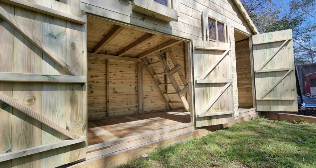 Harvey’s den is a 10′ x 5′ playhouse with a split level inside. Comes with double door and single door to front as standard. Special ornate fittings are used on the door and fascias are available in straight or scalloped finish. Comes flat packed for assembly or can be fitted by our professional installers.